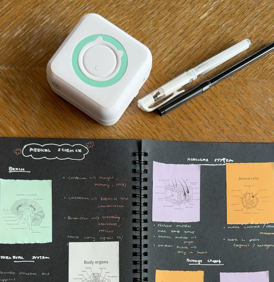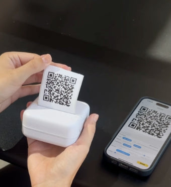 Den bruker spesialpapir for blekkfri utskrift med klebende bakside, slik at du enkelt kan skrive ut, dra av og feste utskriften der du vil.